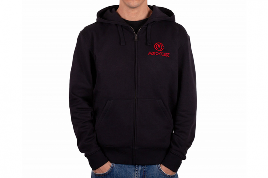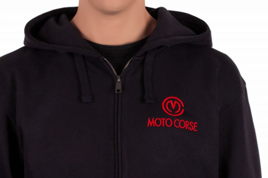 前面にはリブ付きの開口部を持つ独立型のカンガルーポケット、首元にはドローストリング付きのフードを備え、日常の中に静かに寄り添う機能美を体現。左胸と右袖には赤いMOTO CORSE(モトコルセ)のロゴが丁寧に刺繍されており、フード部分にもロゴを同色で配することで、細部に至るまでブランドの誇りを繊細に表現しています。深みのあるブラックのボディに、鮮烈なレッドの刺繍が映えるコントラストは、力強さと洗練を象徴するデザイン。ライディングシーンにはもちろん、街中でもその存在感を放ちます。